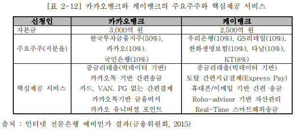 2015년 10월 카카오뱅크, 케이뱅크, I-Bank의 3개 신청자가 인터넷 전문은행 예비인가를 신청하였으며, 이중 카카오뱅크와 케이뱅크가 인가를 받았다. 카카오뱅크는 카카오톡 기반 사업 계획의 혁신성이 인정될 뿐만 아니라 사업 초기 고객기반 구축이 용이한 것으로 평가되는 등 안정적으로 사업 운영이 가능할 것으로 판단된다는 점에서 인가가 허용되었으며, 케이뱅크는 빅데이터를 활용한 신용평가모형 등은 어느 정도 잘 평가되었으나, 자영업자에 집중된 대출방식의 영업위험이 높고 안정적인 사업운영 측면에서 다소 취약한 것으로 평가되어 인가를 받는데 실패하였다.