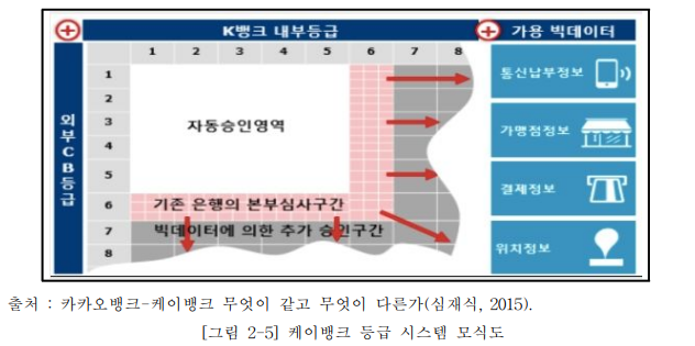 카카오뱅크는 빅데이터를 활용해 자체적인 신용평가 시스템 ‘카카오스코어’를 개발하여 시행하고 있다. 카카오 스코어는 기존 금융권의 신용평가 데이터, 온라인 활용 데이터, 카카오 뱅크만 의 추가적 데이터를 통해 결정한다. 카카오 스코어 신용평가 모델이 제대로 활용되면 개인의 소득 및 소비 정보를 효과적으로 분석하게 되어 기존 10등급까지였던 신용등급 체계를 더욱 세분화하고 중금리 대출 영역을 넓힐 수 있게 된다. 특히 카카오톡 온라인 상거래와 간편결재 카카오페이를 바탕으로 한 사용 내역을 활용하여 은행권보다 세분화된 신용평가가 가능하다.