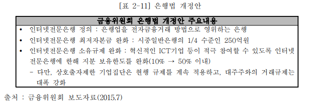 그러나 핀테크가 글로벌 금융시장에서 대세로 자리 잡은 상황에서 흐름에 한국이 뒤처지지 않기 위해서는 핀테크 산업 육성은 반드시 필요한 상황이었고 한국 정부는 2015년에 인터넷 전문은행의 도입을 적극적으로 추진하였다. 2015년 7월 정부는 은행법 개정안을 발의하였는데 그 내용은 아래와 같다.