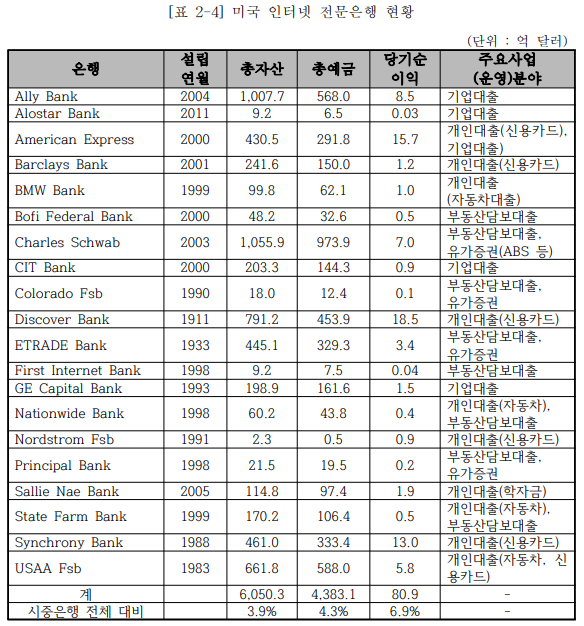 대부분 비은행 금융기관과 비금융기업(산업자본)이 설립을 주도한 것이 특징이며, 미국 최대 인터넷 전문은행인 Charles Schwab Bank와 eTrade는 온라인 증권사가, ING Direct는 보험회 사가 설립하였다. AllyBank와 BMW Bank는 자동차 제조업체 인 GM과 BMW가 주도하여 설립하였으며, 2000년 중반 이후에는 모바일 기기 이용률의 증가와 비즈니스 모델 차별화 전략으로 영업성과가 향상되고 재무구조가 개선되면서 일부 선도적 인터넷 전문은행은 기존 시중 일반은행들을 위협하기 시작하였다.