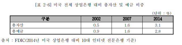 2014년 3월 기준 미국 10대 인터넷 전문은행의 총자산은 4,400억 달러, 총예금은 3,039억 달러를 기록하여 전체 상업은행 대비 각각 3.1%, 2.8%를 기록하고 있다. 영업이익도 증가하여 2013년 7.2억 달러로 상업은행 전체 대비 5.1%를 차지하고 있다.
