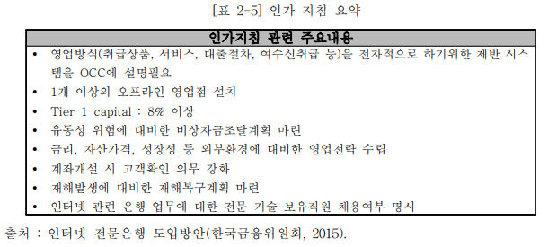 특히 OCC는 인터넷 전문은행의 특수성을 고려하여 인가지침(2001년)을 수립하여 무분별한 난립을 방지하는 조치를 취하였다. OCC는 인터넷 전문은행이 기존 시중 일반은행과는 다른 다 양한 특징을 가지고 있는 점을 고려하여, 고객 접점, 유동성 위험, 고객확인, 재해발생과 관련한 별도 지침을 마련하여 인터넷 전문은행의 영업과 관련한 위험을 사전에 예방할 수 있도록 하였다.