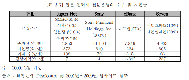 SonyBank 또한 SonyGroup은행과 보험회사를 통할하는 Sony Financial HoldingsInc가 지분의 100%를 소유하고 있으며, 모회사와의 사업 연계 특화된 분야의 영업 전략을 통해 성공적인 기반을 다져가고 있다. 일본에 인터넷 전문은행이 처음 설립될 무렵에는 미국의 많은 인터넷 전문은행들이 부진을 면치 못하고 있었으며, 일본의 실물경제가 침체되고, 부실채권 처리 문제 등으로 금융시스템의 위기론이 나올 때여서, 인터넷 전문은행의 성공 가능성을 예상하기 어려운 시기였다.